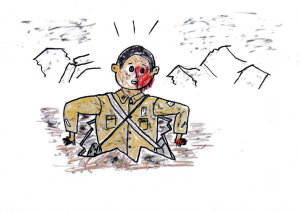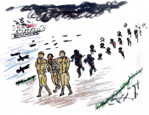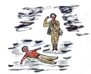 Ten przedstawił się, że jest z takiego a takiego roku i wydziału i poprosił słabym głosem o wodę. Stanąłem natychmiast na baczność, łącząc zbolałe nogi, zasalutowałem i wyrzuciłem z siebie głośno, „Tak jest, już idę po wodę!” Nie znalazłem jednak w pobliżu ani kranu z wodą pitną, ani naczynia, do którego miałbym jej nabrać. I już byłem całkiem zdesperowany, że nie mogę wypełnić rozkazu, gdy po chwili przypomniało mi się, że ktoś mi kiedyś powiedział, „Nie wolno podawać wody poparzonym, bo to niesie śmierć!” Zawahałem się i oddaliłem się stamtąd niepewnie.