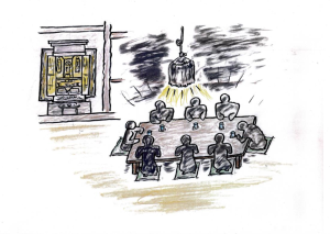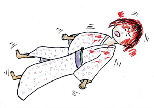 Kiedyś leżąc na szkolnej podłodze, usłyszałem koło głowy cichutki odgłos, jakby coś skapywało. Cała moja buzia pokryta była robalami czerwiami, które od czasu do czasu spadały na ziemię. Miejsca wokół oczy i ust zgniły i pokrywały się parchami, a kiedy otwierałem oczy lub usta, te parchy pękały. W momencie, kiedy gryzłem kulkę ryżową omusubi, zaropiała krew wraz z czerwiami wpadała mi do gardła.