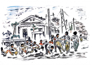 Przemieszczając się wraz z innymi uciekającymi, dotarłem najpierw miejsca schronienia dla ewakuowanych, które znajdowało się w szkole średniej niższego stopnia Koryo. Kiedy obudziłem się w nocy, widziałem klasę, w której leżałem, rozświetloną pożarami w całym mieście na tyle dobrze, że mogłem śledzić ruchy ludzi leżących w niej. Byłem straszliwie głodny, więc zjadłem lunch, który tego dnia kazała mi zabrać ze sobą matka. Jadłem śniadanie i rozmyślałem o mamie, czy jest bezpieczna. Po policzkach ciekły mi łzy. 3版-newest_page18_image-300x212.png)