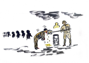 Żołnierz z oddziału pomocy poszkodowanym w nalotach lotniczych zanurzał koniec miotły owiniętej w białą szmatę w ogromnym kuble z olejem jadalnym i kierował ociekający olejem czubek w stronę poparzonego. Ten sam smarował sobie poparzone miejsca, nakładając na nie szmatę. W kolejce po pomoc czekały tłumy, więc jak ktoś smarował się zbyt ślamazarnie, pohukiwano na niego groźnie.