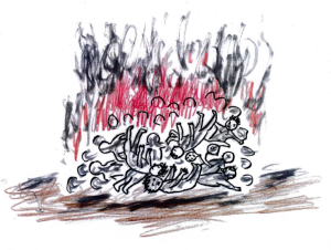 „Wy” byliście tak blisko hipocentrum wybuchu, poparzeni falą gorąca, wołaliście na cały głos, że jest wam GORĄCO. Kuliliście swe poparzone ciałka, przestępując z nogi na nogę z przerażenia. Potem rzuceni daleko przez silny podmuch wiatru od wybuchu, zostaliście powaleni na ziemię. Nie da się wyobrazić waszych cierpiących straszliwie sylwetek.