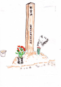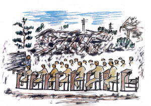 Pewnego zimnego lutowego poranka następnego roku wychowawca klasowy i około dziesięciu uczniów, włączając mnie, którzy przeżyli (nie zginęli 6 sierpnia, bo z jakiś powodów nie wyszli na roboty w mieście; przypis tłumacza), udaliśmy się tam, gdzie prawdopodobnie pracowali uczniowie naszej szkoły przy wyburzaniu domów. Wystawiliśmy tam symboliczny obelisk cenotafu. Była to jedna z kolumn z powalonej szkoły, odpowiednio przycięta. Na miejscu prac wyburzeniowych zbieraliśmy guziki, pudełka na lunch i inne pamiątki po naszych zmarłych kolegach, które wygrzebywaliśmy z ziemi. Potem przekazaliśmy je rodzinom zaginionych.