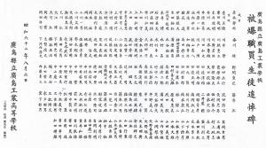 W kwietniu 1945 roku (rok 20 ery Showa), kiedy kwitły kwiaty wiśni braliśmy razem udział w uroczystości rozpoczęcia roku szkolnego w wielkiej sali gimnastycznej. Dyrektor szkoły, pan Osono witał nas następującymi słowami w wojskowym stylu. „W obecnej bardzo trudnej sytuacji wojennej uroczyście obchodzimy wasze wstąpienie do naszej szkoły o długiej historii i tradycji, gdzie będziecie się uczyć różnych technicznych przedmiotów, żeby przydać się w przyszłości naszej ukochanej ojczyźnie.”