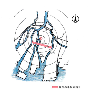 Czerwona linia to obecna Aleja Pokoju (Heiwa Odori)