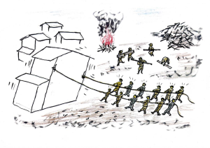 Podczas wojny szalały w Hiroshimie pożary wywołane nalotami lotniczymi. Ażeby zabezpieczyć miasto przed tymi rozszerzającymi się pożarami, przygotowywano w wielu miejscach w centrum pasy przeciwpożarowe, zawczasu wyburzając drewniane budynki. Była to tzw. „ewakuacja budynków” (tatemono sokai). Za każdym razem, kiedy szedłem na taką „ewakuację” i widziałem, jak wyburzano domy,