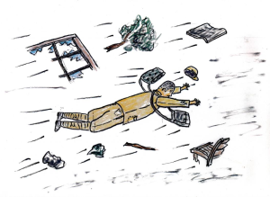 Kiedy dotarłem do dziury, z której wydobywało się światło, moim oczom ukazał się widok, który mnie kompletnie powalił. Jak okiem sięgnąć, widziałem wszędzie powalone budynki szkolne, obrócone w morze gruzu. Spod zgliszczy, spod zawalonych budynków dochodziły mnie zewsząd głośne nawoływania i jęki o pomoc. Uczniowie i nauczyciele biegali wokoło, by nieść pomoc innym.